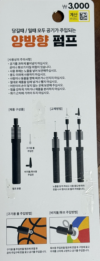 저는 그동안 체육관 갈 때마다 구비된 압축기로 공에 바람을 넣었는데, 매번 번거롭기도 하고 공이 집에 있을 때는 불편했습니다. 그래서 이번에 다이소에서 3,000원짜리 양방향 펌프를 구입해 직접 바람을 넣어봤습니다.